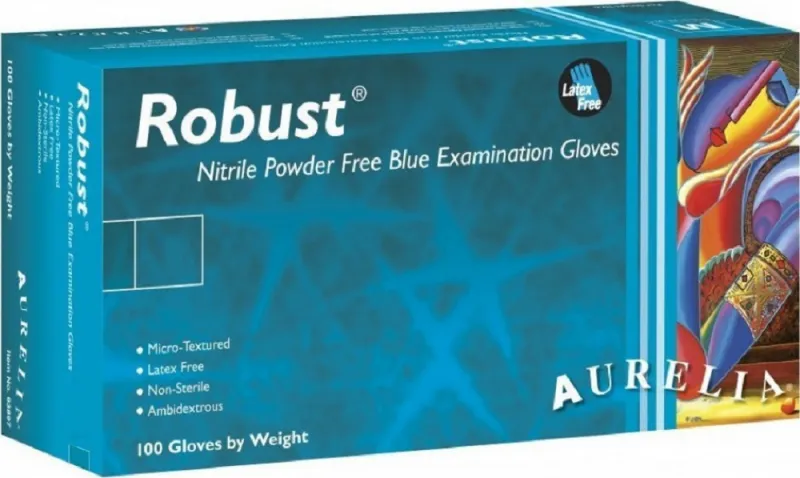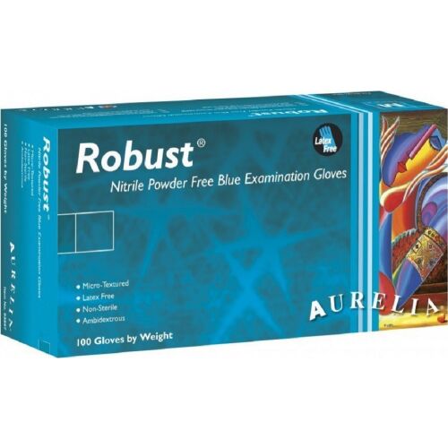 Εξεταστικά γάντια Aurelia Robust μπλε νιτριλίου (χωρίς latex) χωρίς πούδρα, κατασκευασμένα από 100% νιτρίλιο (χωρίς latex), αμφιδέξια, μπλε χρώματος, μη αποστειρωμένα.