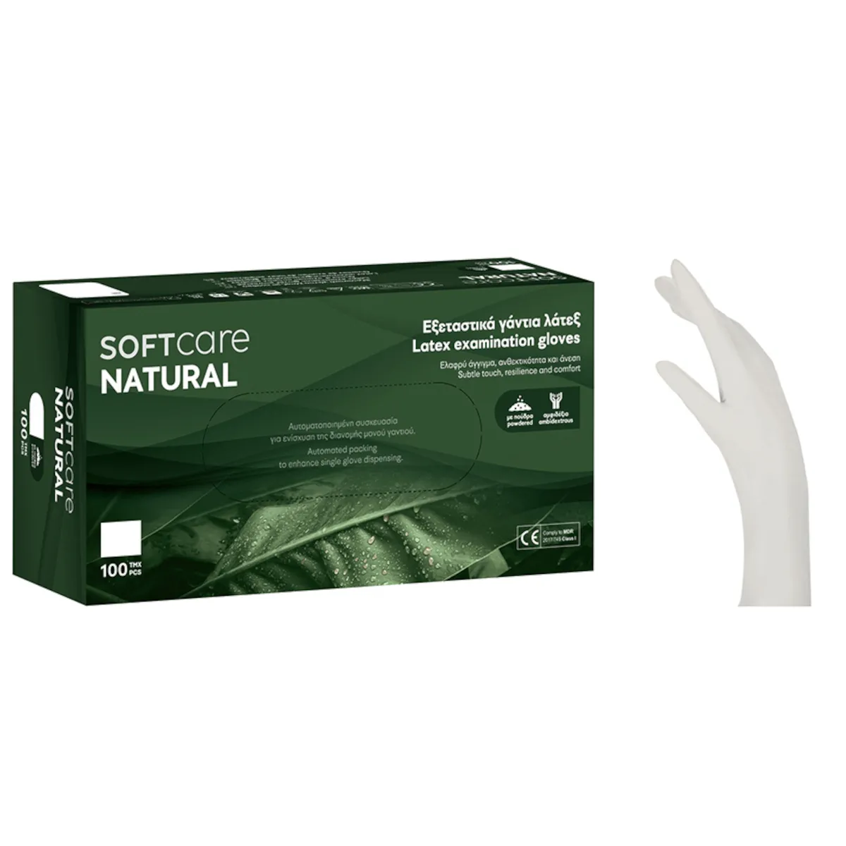 Εξεταστικά γάντια Soft Touch ελαφρώς πουδραρισμένα, μίας χρήσης, αμφιδέξια, από φυσικό latex, σε κρεμώδες λευκό χρώμα και μη αποστειρωμένα.