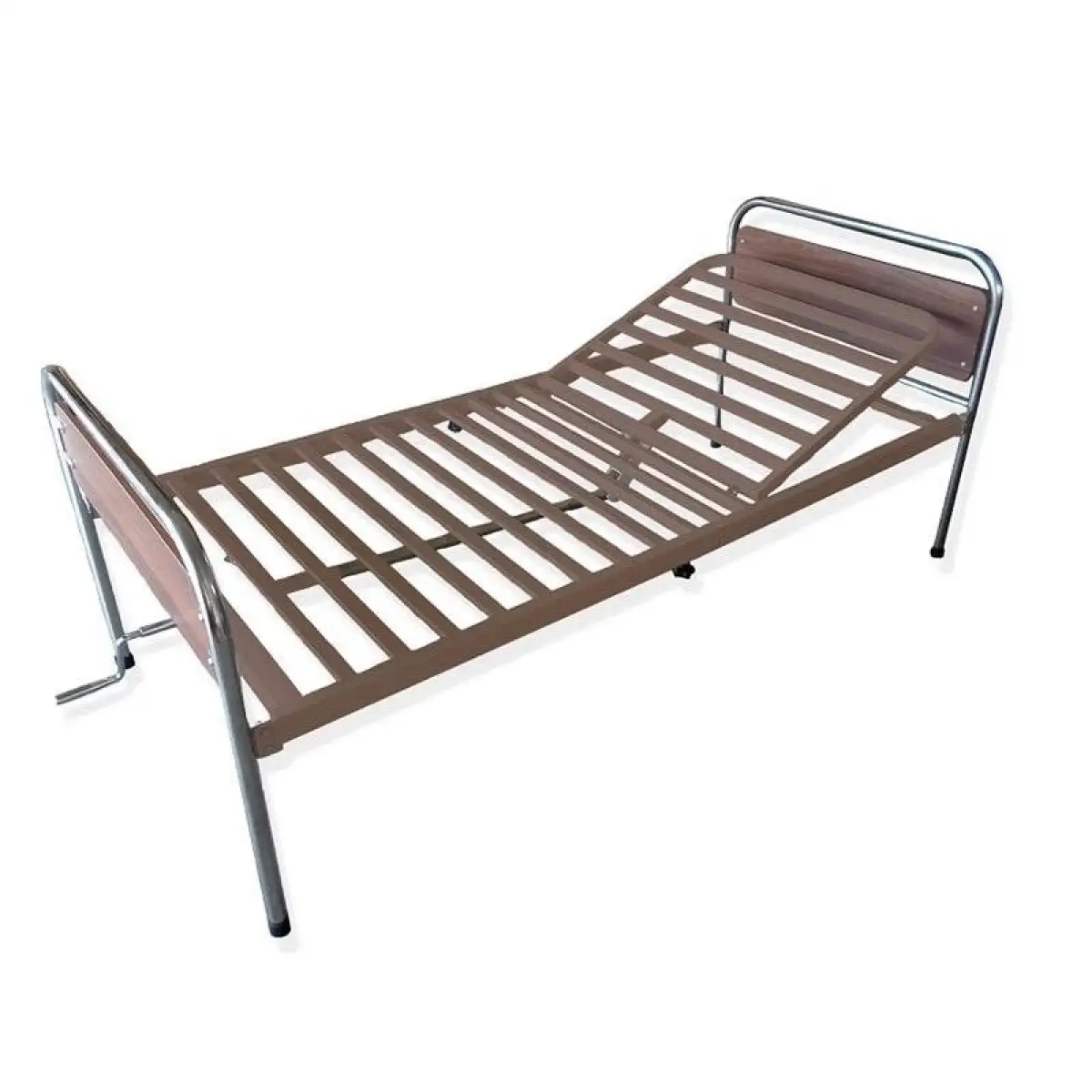Το κρεβάτι είναι μονόσπαστο χειροκίνητο νοσοκομειακό, στο οποίο ανασηκώνεται η πλάτη με μανιβέλα. Στην τιμή συμπεριλαμβάνονται τα κάγκελα και οι ρόδες εφόσον το επιθυμεί ο ασθενής.