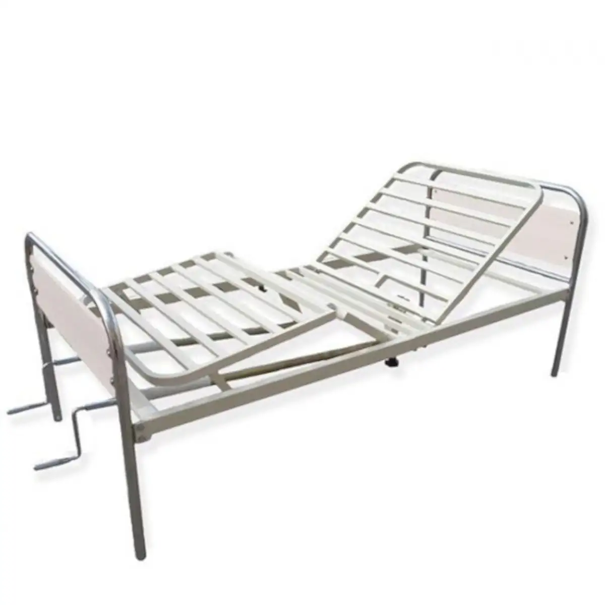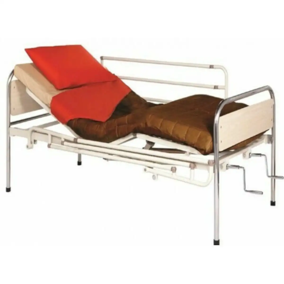 Νοσοκομειακό μεταλλικό κρεβάτι πολύσπαστο με ξύλινες μετώπες. Ανύψωση πλάτης και ποδιών με μανιβέλα. Ο σκελετός του κρεβατιού αποτελείται από δύο μέρη για εύκολη μεταφορά και αποθήκευση. Οι ρόδες, οι τροχοί, το στρώμα και ο αναρτήρας πωλούνται ξεχωριστά.
