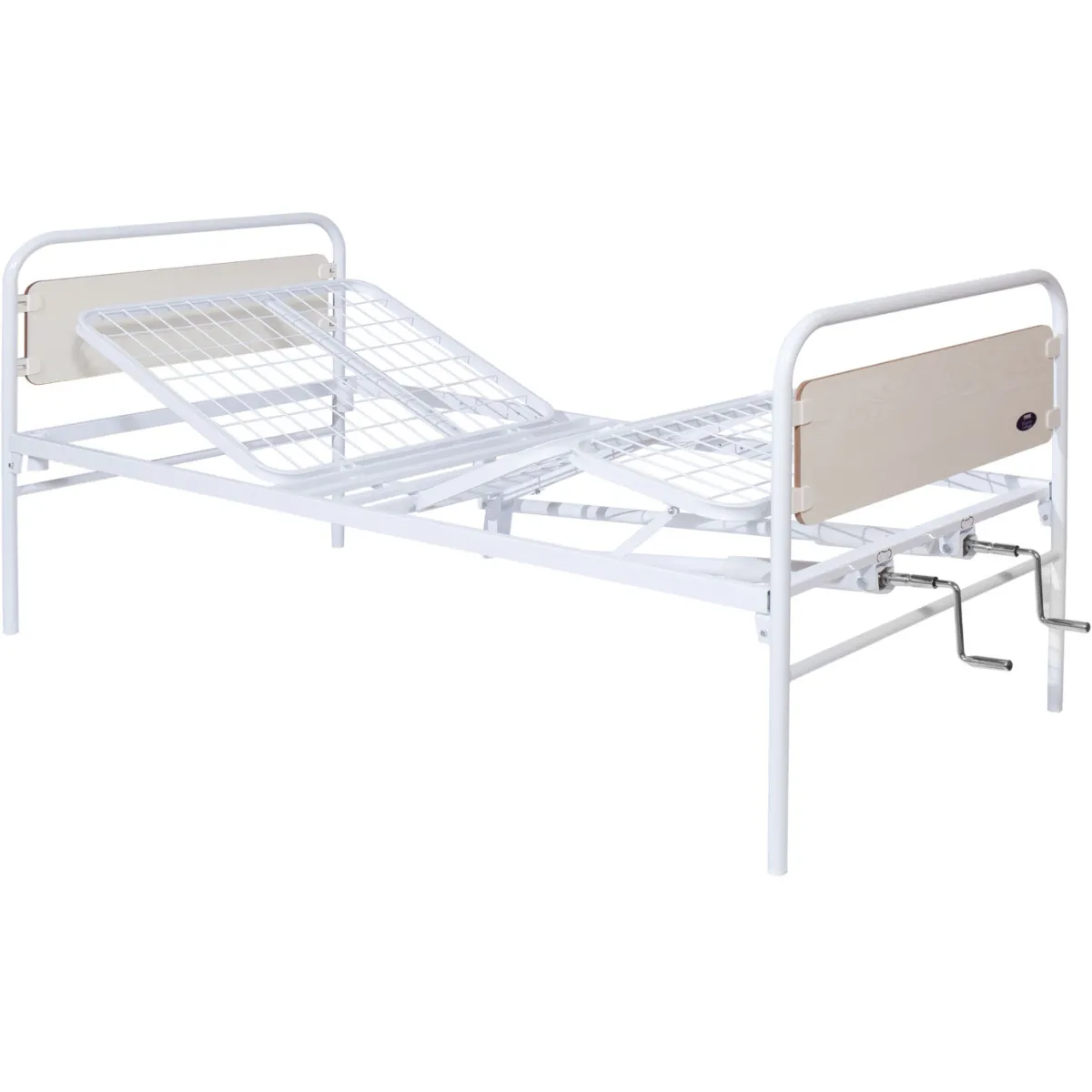 Νοσοκομειακό μεταλλικό κρεβάτι πολύσπαστο  με ξύλινες μετώπες. Ανύψωση πλάτης και ποδιών με μανιβέλα.  Οι ρόδες, το στρώμα και ο αναρτήρας πωλούνται ξεχωριστά.