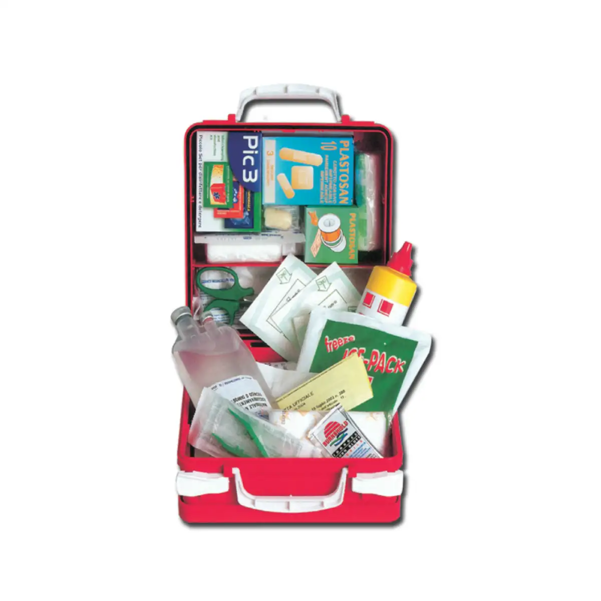 Πλαστικό βαλιτσάκι πρώτων βοηθειών εξοπλισμένο με όλα τα απαραίτητα είδη για έκτακτη ανάγκη.