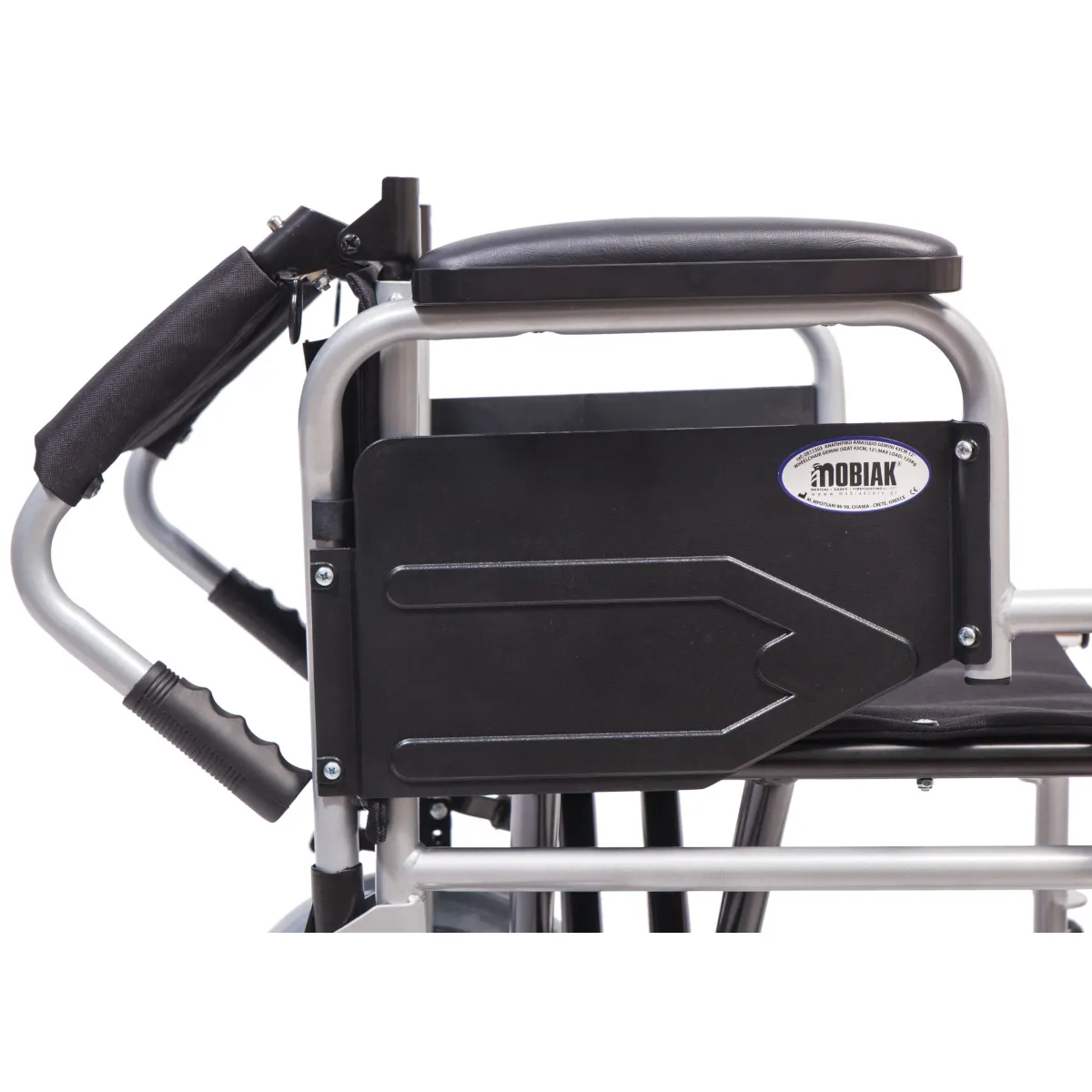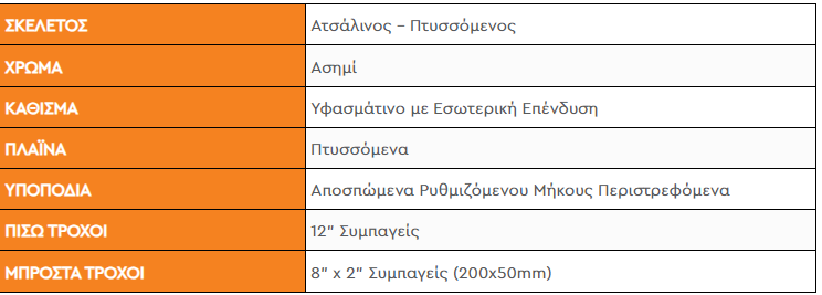 Αναπηρικό αμαξίδιο με ατσάλινο σκελετό. Τα πλαινά είναι ανυψούμενα, με PVC μαξιλαράκι και τα υποπόδια είναι  αποσπώμενα. Οι τροχοί είναι μεσαίοι και συμπαγείς με επιπλέον χαρακτηριστικό τη διπλή σταυρωτή μπάρα στήριξης κάτω από το κάθισμα.  Υλικό καθίσματος & πλάτης: νάυλον με εσωτερική επένδυση. Το πατάκι του υποποδίου είναι πλαστικό.  Το μπροστινό πιρούνι είναι σιδερένιο. Δεν έχει φρένα στις χειρολαβές.