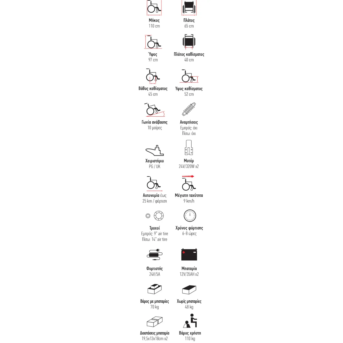 Οι µπαταρίες αφαιρούνται έυκολα. Το χειριστήριο τοποθετείται αµφίπλευρα. Ζάντες αλουµινίου και ροδάκια µη ανατροπής "Αnti Tip".