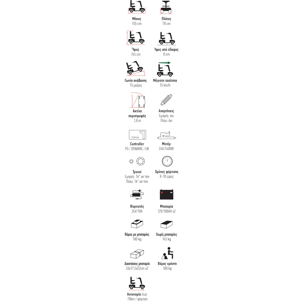 • Βάρος με μπαταρίες: 180kg
