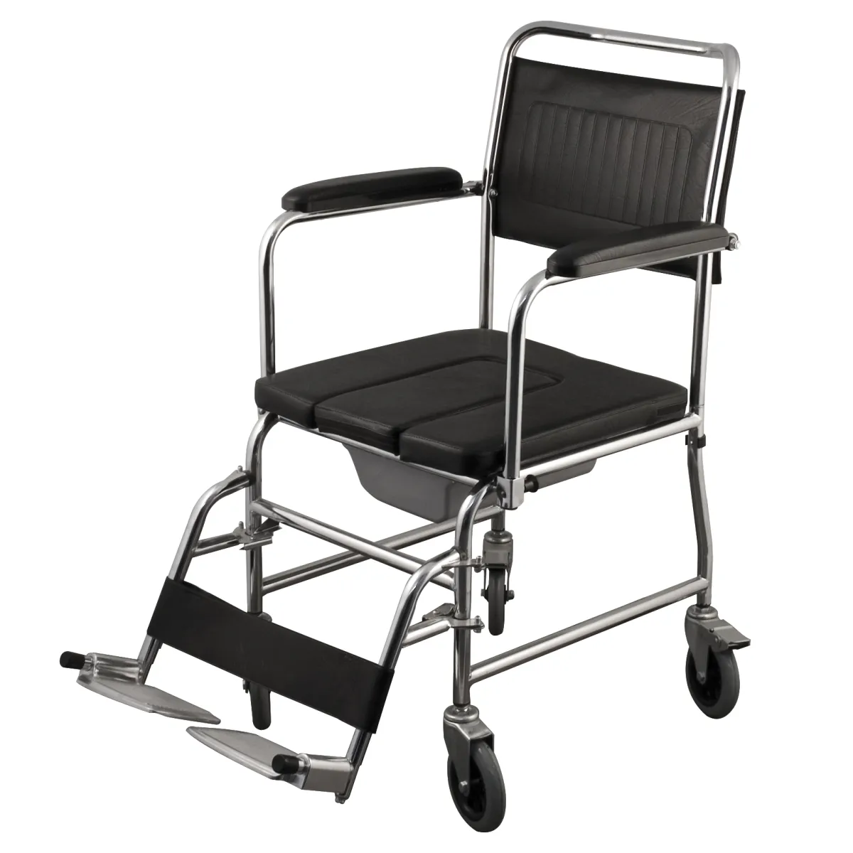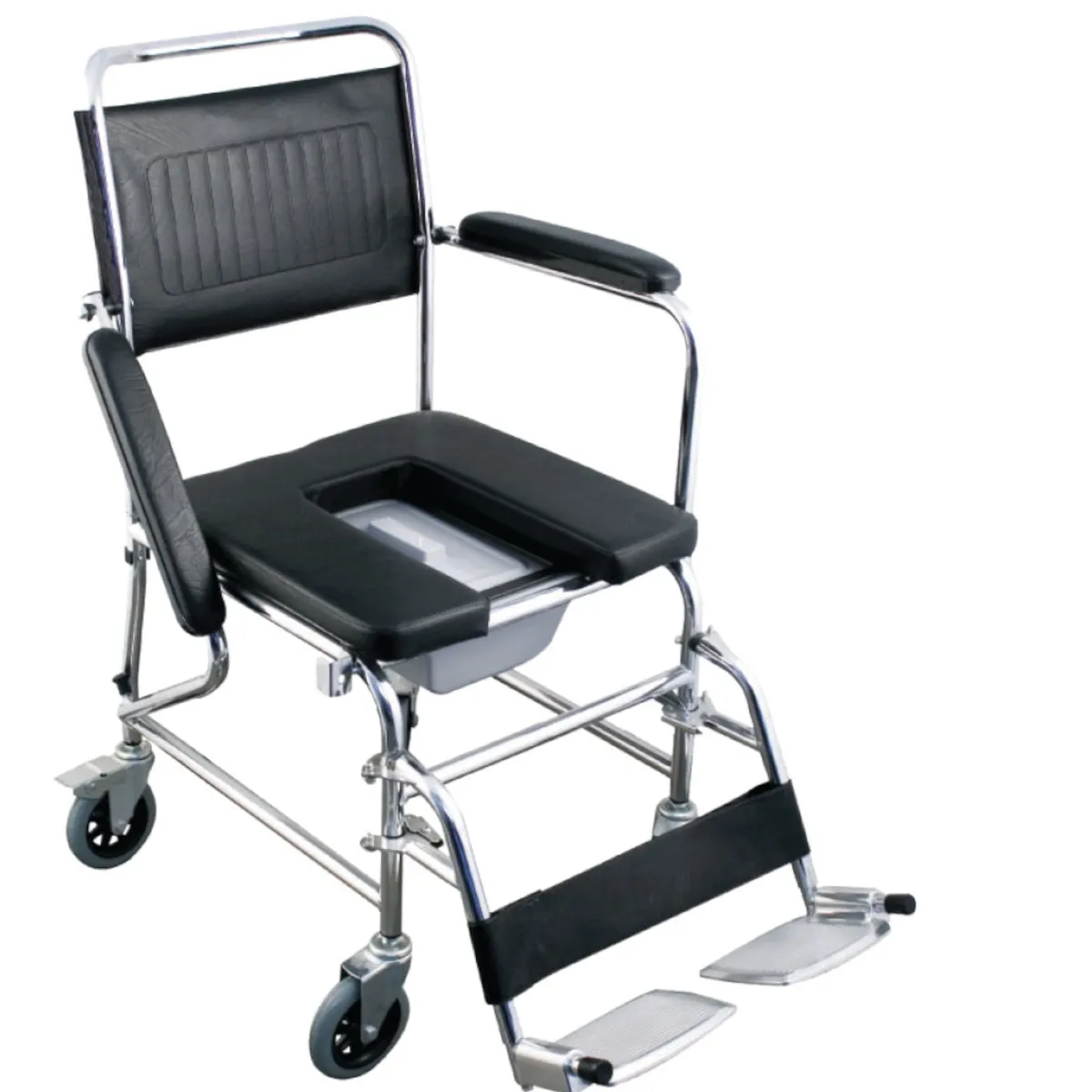 Αναπηρικό αμαξίδιο απλού τύπου με δοχείο και συρταρωτό κάθισμα για εύκολη χρήση. Κατασκευασμένο από ατσάλινο σκελετό. Διαθέτει πτυσσόμενα πλαϊνά στηρίγματα και αποσπώμενα υποπόδια. Τα φρένα βρίσκονται στους πίσω τροχούς.