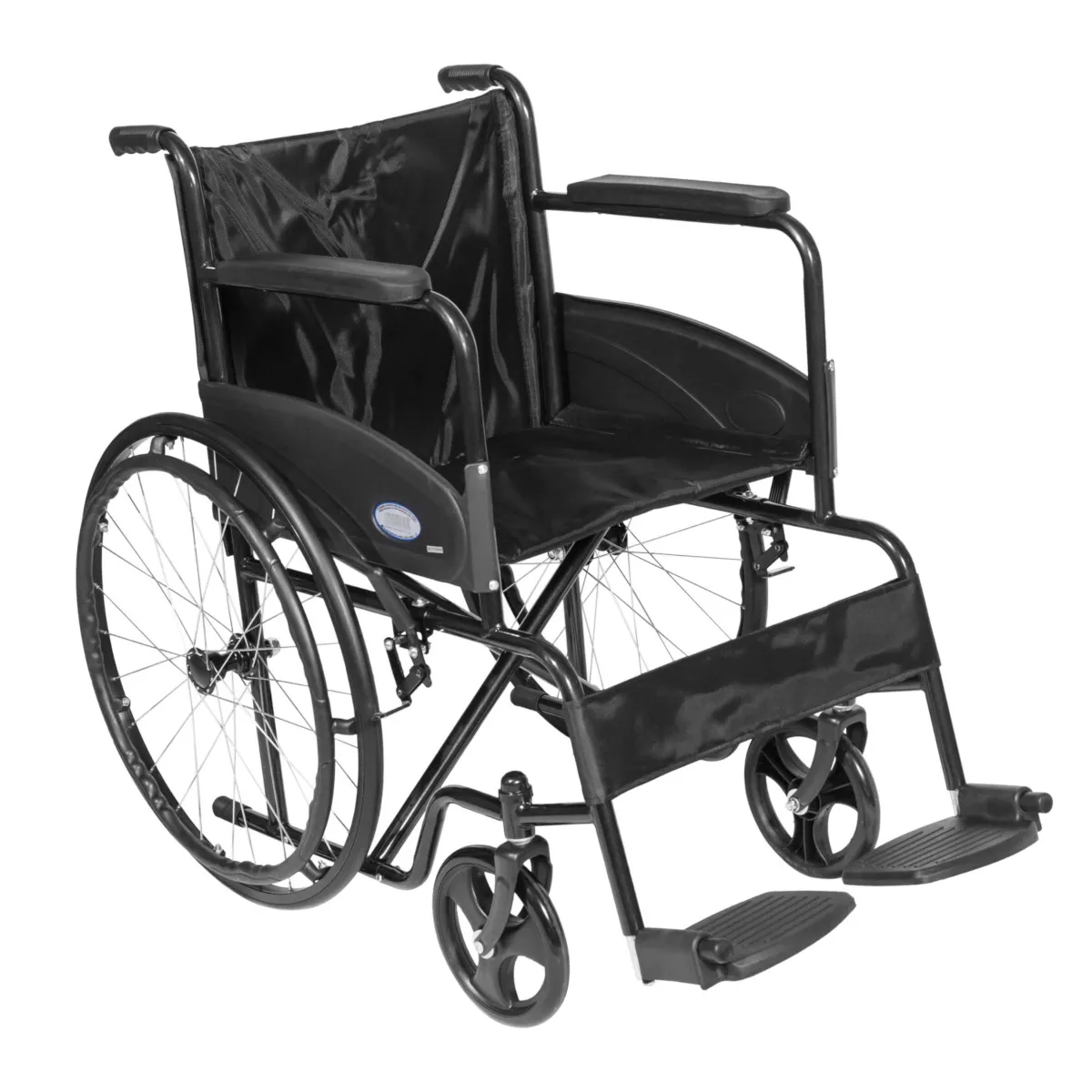 Αναπηρικό αμαξίδιο απλού τύπου με μεγάλους συμπαγείς τροχούς. Είναι πτυσσόμενο για εύκολη μεταφορά και εξοικονόμηση χώρου. Τα πλαϊνά και τα υποπόδια είναι σταθερά.